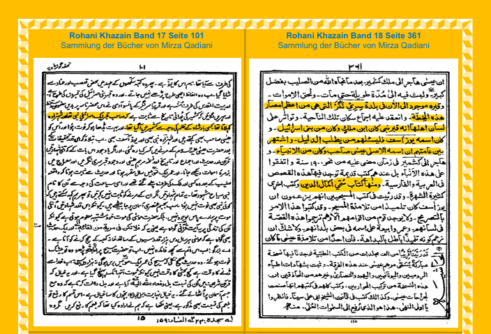 Mirza sagt, dass Jesus (AS) vom Kreuz herabkam. Der Koran sagt, dass er (AS) nicht gekreuzigt wurde. Mirza hat gegen den Koran geschrieben und das ist eine Verletzung des Korans.