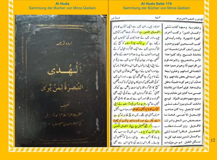 Ich werde das zweite Buch namens “Kamaaluddin wa Tamaamum Nima” vorstellen. O Qadianis, Mirza hat dieses Buch nicht nur in einem seiner Bücher erwähnt, sondern auch in einem anderen Buch “Rouhani Khazain” (Band 18, Seite 361). Auf Seite 361 steht das Wort “Akmal-ud-din”. Dieses Buch ist auf Arabisch und die Übersetzung dieses Buches durch das Volk der Qadiani trägt den Titel “Al-Huda”. Seine Seitennummer ist 173. Mirza Qadiani schreibt darin: