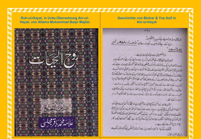 In diesem Buch “Ain-ul-Hayat” wird die Geschichte von Bluhar und Yuz-e-Asif erzählt. Über die Geschichte schreibt Mirza Qadiani in einem Band