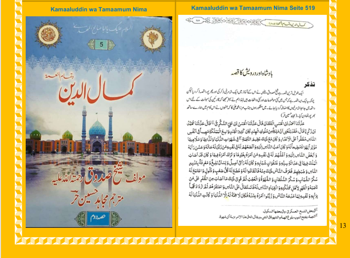 Nun sollten wir uns dem Buch “Akmal-ud-din” zuwenden. Sehen wir uns an, was auf Seite 519 dieses Buches erwähnt wird. Das ist die Geschichte des Königs und der Derwische. Diese Geschichte ist auf Arabisch und Urdu, und der Name des Buches ist “Kamaaluddin wa Tamaamum Nima”. Das ist dieselbe Geschichte, die ich vorhin erzählte, über die Art von König, der er war, aber sie wird in den Schlagzeilen dieses Buches erzählt. Die erste Überschrift lautet: “Die Not des Schurkenkönigs”, und lassen Sie uns weitermachen, die nächste Überschrift ist: “Der König hat sich mit einem Kind geschenkt”. Die Geschichte ist fast die gleiche in beiden Büchern mit einem Unterschied von neunzehn bis zwanzig Wörtern.