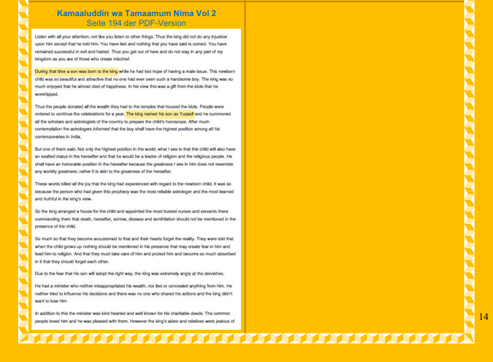 annte seinen Sohn Yuz-e-Asif. Und er rief Astrologen, die in ihrer Kunst kundig waren, und viele von ihnen sagten zum König: Dieses Kind wird sehr gut, edel und tugendhaft sein; er wird viele Menschen zum Guten bringen; das Kind wird nicht nur überlegen und edel in dieser Welt, sondern wird auch der Führer der religiösen Männer im Jenseits. Dann trifft ein Mann namens Hakim Bluhar den Prinzen, der ein großer asketischer, frommer und tugendhafter Mann ist. Der Prinz lernt einige religiöse Dinge unter ihm. Jetzt lehrt Bluhar ihn Religion. Die 20 bis 25 Seiten sagen, dass der Prinz Religion von ihm lernt.