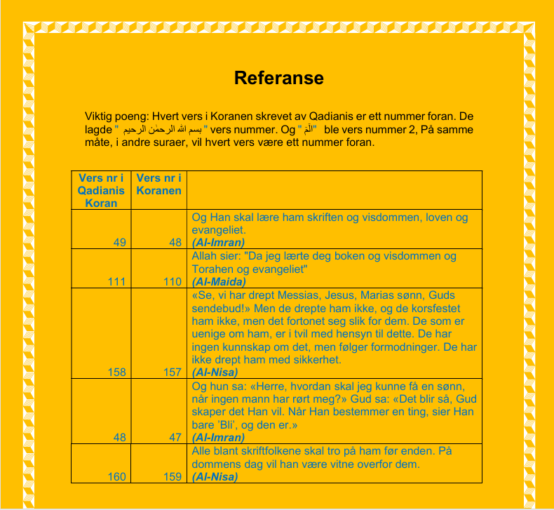Koranen sier at Jesus ble født uten far, og at Jesu bok er kjent som “Injeel”. Qadianis! Det er opp til deg å bestemme om du står sammen med Koranen eller med Mirza Qadiani. I følge Mirza Qadiani er Yuz-e-Asif sønn av en konge som er Jesus, og ifølge oss er Marias sønn Jesus (AS). Koranen nevner Jesus sammen med Maria. Og in “Akmal-ud-din”, Yuz-e-Asif blir nevnt med sin far, kongen. Så avgjørelsen er din å ta. Min jobb er å vise deg fakta og få fram sannheten. Jeg vil gjerne sitere et vers fra den hellige Koranen. I vers