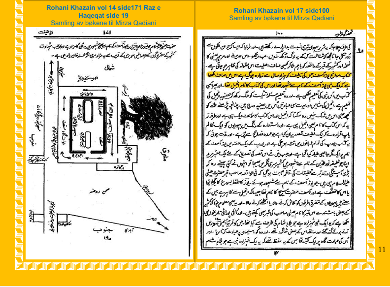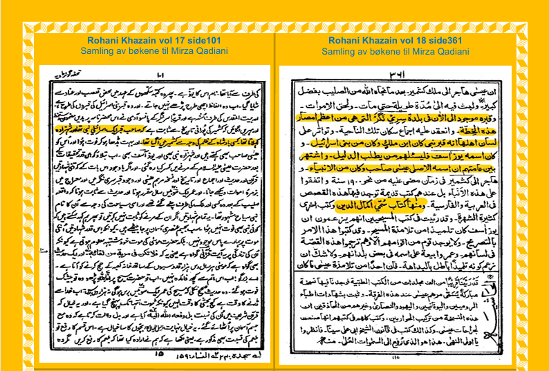 Her vil jeg gjerne gi deg en annen referanse til Mirza Qadiani bok. In volum 17 av “Rohani Khazain”, Mirza Qadiani nevner ikke Yusufs far. Så fra dette blir vi kjent med at Mirza Qadiani kjente hele historien, men han hadde forrådt Ummah. De er sidens nummer 100 og 101 i boka. Mirza Qadiani skriver: ” En profet ble kjent som Yuz-e-Asif og hans bok ble kalt Injeel “. Jeg har allerede nevnt hvis bok “Injeel” er. Mirza sier videre: ” Faktisk er eieren av graven Jesus.” Og han legger: ” Han ble kjent som Yuz-e-Asif.” Nå la oss se hva Qadianis har denne troen; og den som har denne troen, Gud vil sikkert spørre ham:” Hvordan laget du en person til Jesus som hadde en far?”