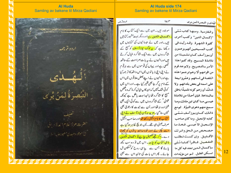 På neste side sier Qadiani: En av disse bøkene heter “Akmal-ud-Din”. Han forteller videre: Videre betegnet Yuz-e-Asif sin bok “Injeel”. (Astaghfirullah).