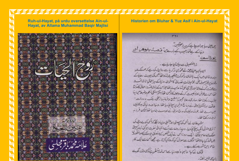 Jeg forteller denne historien kort. Det er skrevet at Ibn Babawiyah (RA) forteller fra Muhammad ibn Zakariya (RA) at en konge bodde i kongedømmet India med stor prakt. Han var en tilbeder og elsker selvet, alt ondskap i verden var tilstede i ham, han tilbad avguder, han behandlet mennesker som han ville, han var luksuriøs, han var beruset av umoral. Han behandlet de som beundret ham godt. Men i mange år hadde han ikke noe hannebarn, altså, han hadde ingen sønn. Men mange år senere ble kongen født en sønn. Han var overbevist om at belønningen han mottok skyldtes disse avgudene. Kongen kalte sønnen Yuz-e-Asif. Han kalte astrologer som var eksperter på kunsten deres. Og mange av dem sa kongen: “Dette barnet vil være veldig bra, edelt og dydig; han vil bringe mange mennesker til det gode; barnet vil ikke bare være overlegen og edelt i denne verden, men vil også være leder for de religiøse menn i det hinsidige. Så møter en mann ved navn Hakim Bluhar prinsen som er en stor asketisk, hengiven og dydig mann. Prinsen lærer noen religiøse ting under seg. Nå lærer Bluhar ham religion. De 20 til 25 sidene sier at prinsen lærer religion av ham.