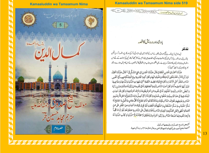 Nå skal vi bevege oss mot boken “Akmal-ud-din”. La oss se hva som er nevnt på side 519 i denne boka. Dette er historien om kongen og dervishene. Denne historien er både på arabisk og urdu, og navnet på boka er “Kamaaluddin wa Tamaamum Nima”. Dette er den samme historien jeg fortalte tidligere om hva slags konge han var, men det blir fortalt i overskriftene i denne boka. Den første overskriften er: “The Plight of the Rogue King”, og la oss gå videre, neste overskrift er: “Kongen skjenket med et barn “. Historien er nesten den samme i begge bøkene med en forskjell på nitten til tjue ord.